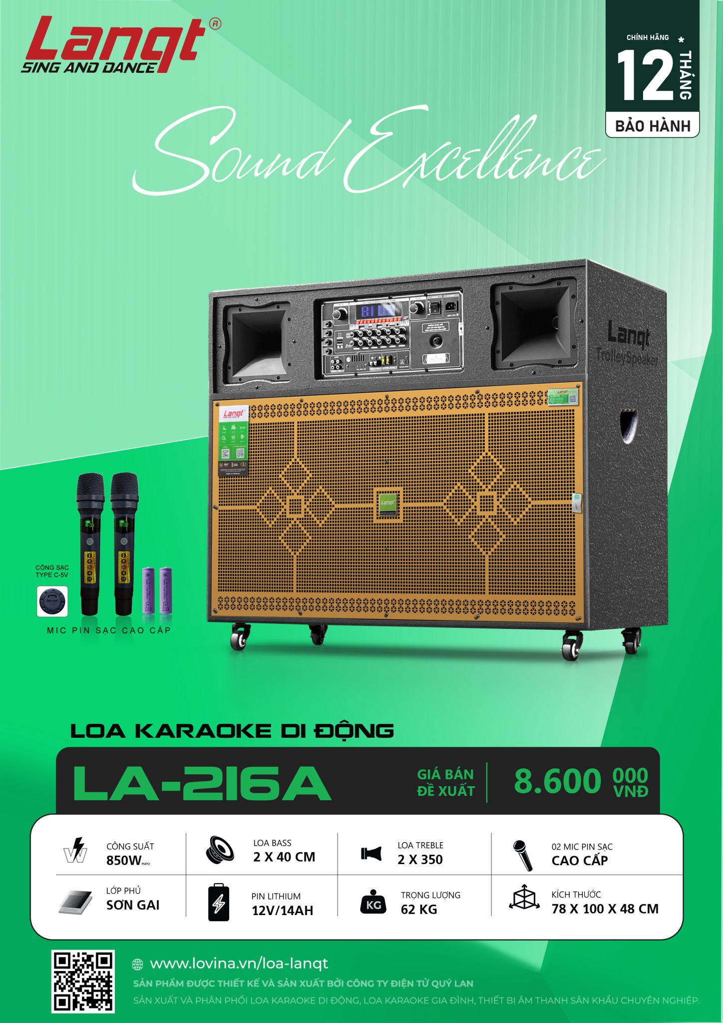 Thông số kỹ thuật của loa kéo Lanqt LA 216A Bass đôi 40 cm